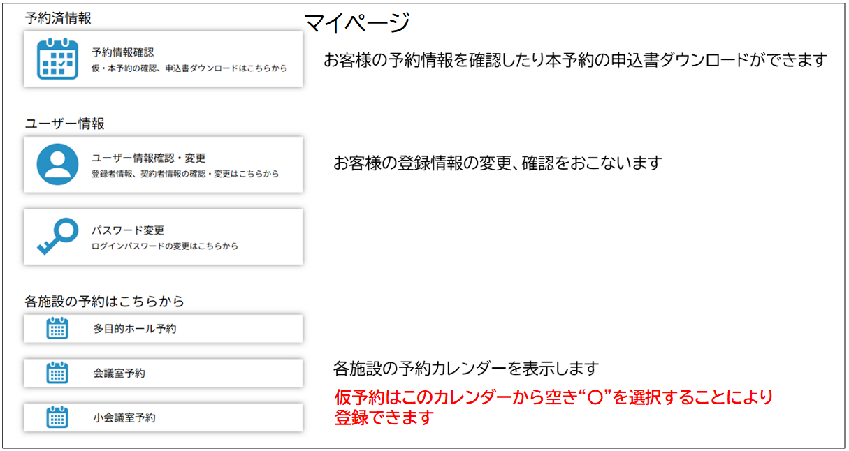 予約情報確認にて予約内容を表示、“使用申込書ダウンロード”をクリックし本申込をおこないます。